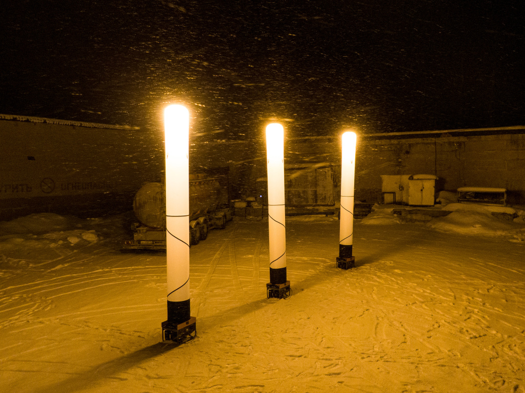 Отличительной особенностью световых мачт от других источников света является применяемые в устройстве мощные лампы. Металлогалогенная излучает свет за счет электрического разряда внутри паров ртути, в которые примешаны специальные излучающие добавки – галогениды металлов. Такая лампа дает естественный рассеянный дневной свет, не режущий глаза, так как отсутствует точечный источник света. Натриевая лампа дает рассеянный оранжевый или желтый поток света. Светоизлучателем является дуговой разряд в парах металлического натрия. Световая мачта обеспечивает равномерное освещение на 360 градусов. В зависимости от модели устройства высота надутого цилиндра может быть от двух до восьми метров. Восьмиметровая мачта обеспечивает круговое освещение до 20.000 кв.метров.