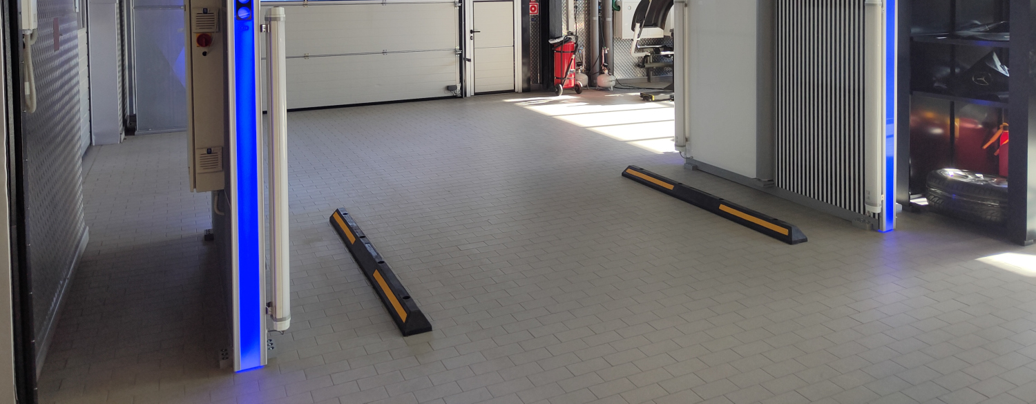 А что же въезд на станцию и движение между датчиков и камер сканнера? Нет, автоматизация процесса туда еще не проникла и работник автосервиса или владелец сам прогоняет автомобиль по заданной полосе. Оборудование, хоть и альтернативных производителей, но от этого дешевым не стало и повредить его или совсем вывести из строя неумелым маневром, очень даже запросто. Как этого избежать? Легко! Установить вдоль внешних границ полосы движения резиновые или полимер-песчаные колесоотбойники, не дающие колесам автомобиля съехать в сторону.
